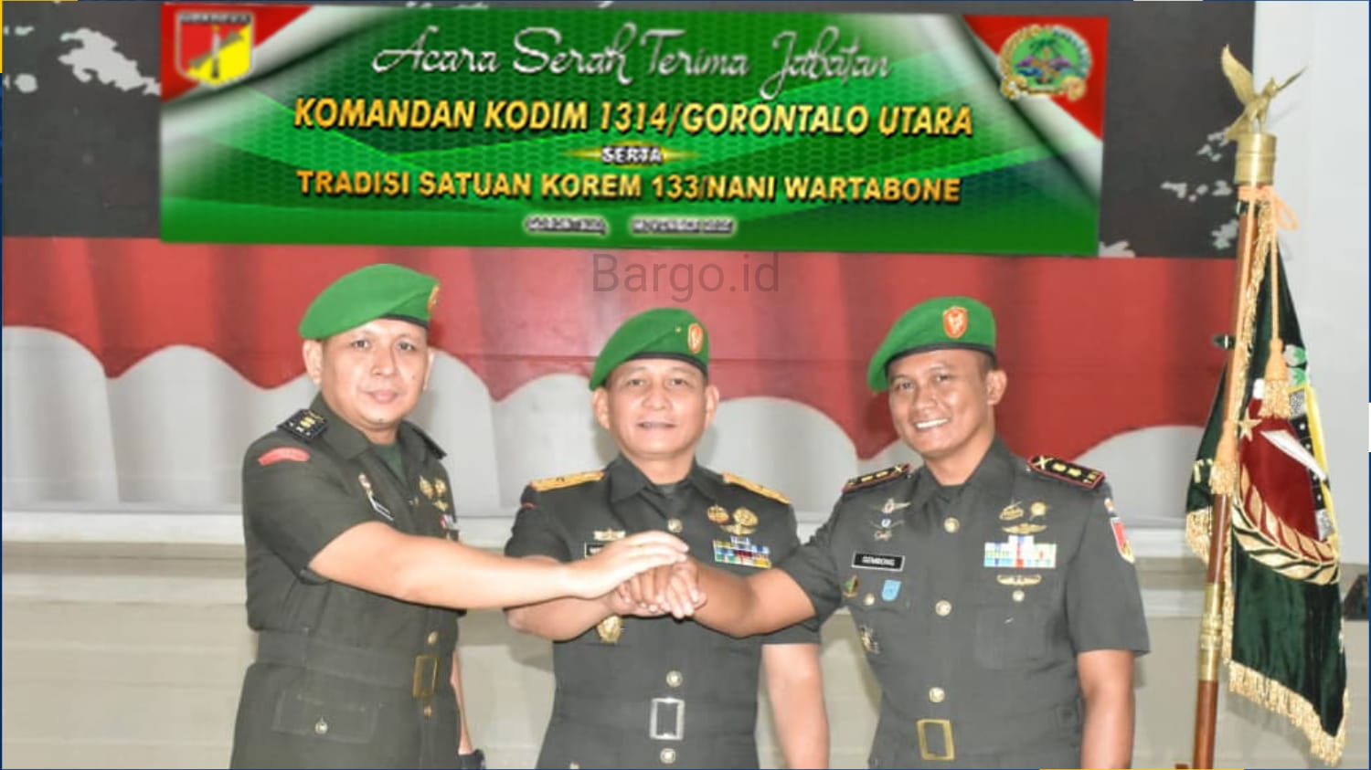 POHUWATO, BARGO.ID – Komandan Korem (Danrem) 133/Nani Wartabone, Brigjen TNI Hardo Sihotang memimpin langsung prosesi Serah Terima Jabatan (Sertijab) Komandan Kodim (Dandim) 1314/Gorontalo Utara, yang dirangkaikan dengan Tradisi Satuan Korem 133/NW. Kegiatan berlangsung khidmat di Aula Kusno Danupoyo, Desa Tridharma, Kecamatan Pulubala, Kabupaten Gorontalo, Rabu (03/12/2025).