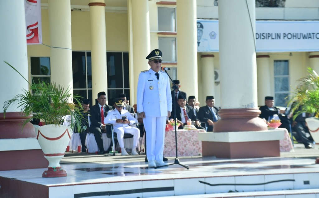 Upacara tersebut dipimpin langsung Bupati Pohuwato Saipul A. Mbuinga dan dihadiri Wakil Bupati Iwan S. Adam, Ketua DPRD Beni Nento, unsur Forkopimda, serta jajaran pemerintah daerah.