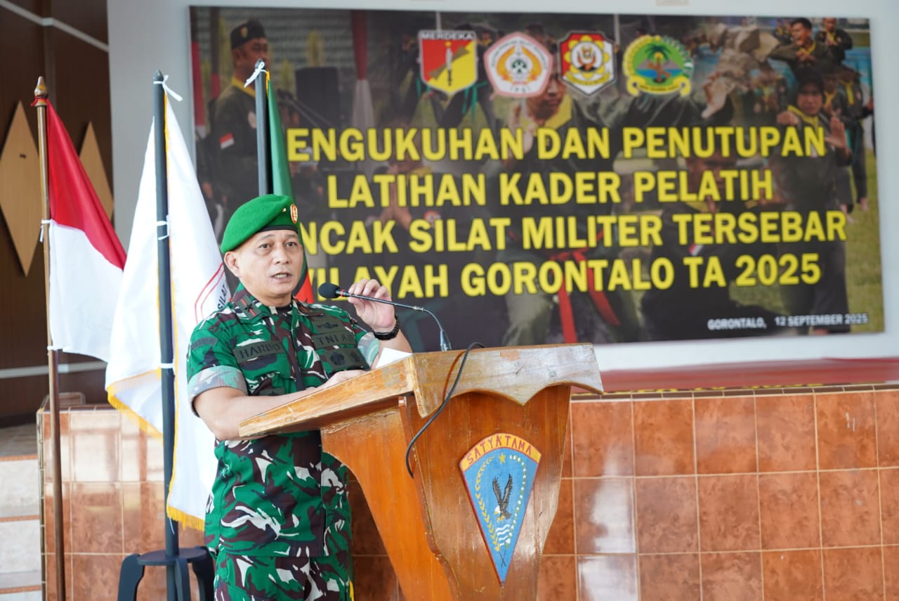 POHUWATO. BARGO.ID – Danrem 133/Nani Wartabone Brigjen TNI Hardo Sihotang memimpin upacara pengukuhan dan penutupan Latihan Kader Pelatih Pencak Silat Militer Tersebar Wilayah Gorontalo TA 2025. Kegiatan berlangsung di Aula Mayonif 713/ST, Telaga Biru, Gorontalo, Jumat (12/9/2025).