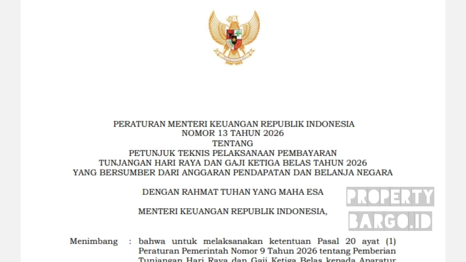 JAKARTA, BARGO.ID – Pemerintah resmi menerbitkan aturan teknis pencairan Tunjangan Hari Raya (THR) dan gaji ketiga belas tahun 2026 yang bersumber dari APBN. Aturan tersebut tertuang dalam Peraturan Menteri Keuangan yang diteken langsung oleh Menteri Keuangan RI, Purbaya Yudhi Sadewa, pada 4 Maret 2026 di Jakarta.